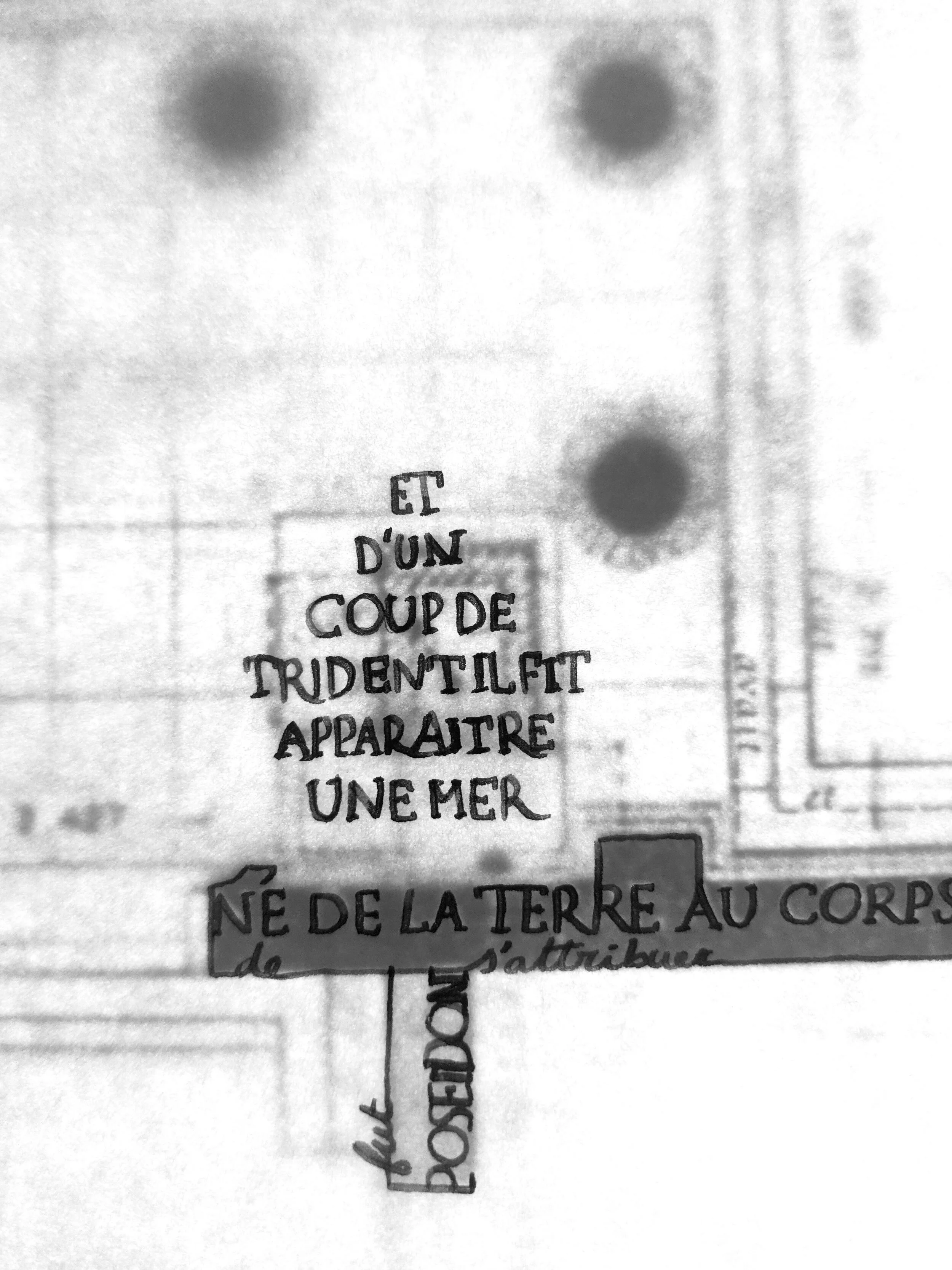 Je décidai de cartographier mon passage sur les sites visités et d’y inscrire ma prière. Ce geste simple de l’écriture était le plus immédiat, le plus vrai. Je commençai et me mis à re-dessiner les cartes des sanctuaires d’après leurs relevés archéologiques. Mais quelque chose ne fonctionnait pas. Ces lieux ont été créés par les mots, je l’ai dit. Ce sont des chants, des prières qui les ont fait exister en premier lieu. Si un aède n’avait pas chanté la présence du divin à Delos, Delphes, Athènes, Eleusis ou Epidaure, alors jamais ces sanctuaires n’auraient été élevés. Les mythes eux-mêmes devaient figurer sur mes cartes et, comme ces lieux, allaient les construire. Je remplaçai les murs dessinés, les marches et les colonnes par les textes des aèdes et poètes relatant la présence du dieu sur le sanctuaire. Ainsi, visuellement, les phrases devinrent murs, les mots dessinèrent des temples et j’inscrivais ma prière - d’une autre couleur - pour montrer que sur cette strate primordiale et mythologique existait désormais la trace du chant que j’avais performé sur place. La carte mêle donc, sur la même surface, les premiers et le dernier chant offerts au dieu sur ce lieu. Elle devient le palimpseste de son identité, la trace de sa présence chantée.